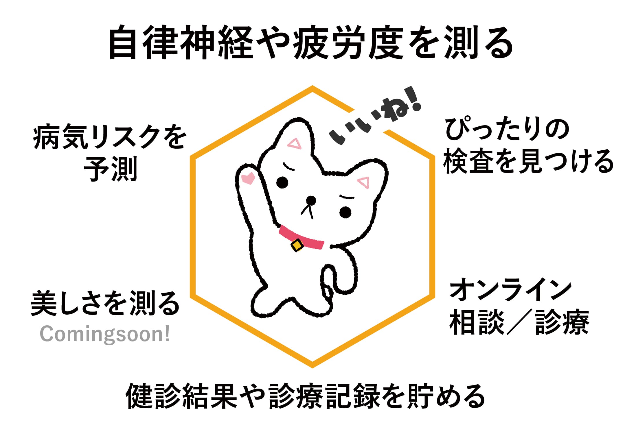 カルテコは、スマートフォンのカメラで心拍変動(HRV)を計測し、自律神経の状態や疲労度をスコア化できる健康管理アプリです。人と犬・猫の自律神経を10秒でチェック。病気リスク予測や健診結果の管理、家族間でのデータ共有まで一つのアプリで行えます。
